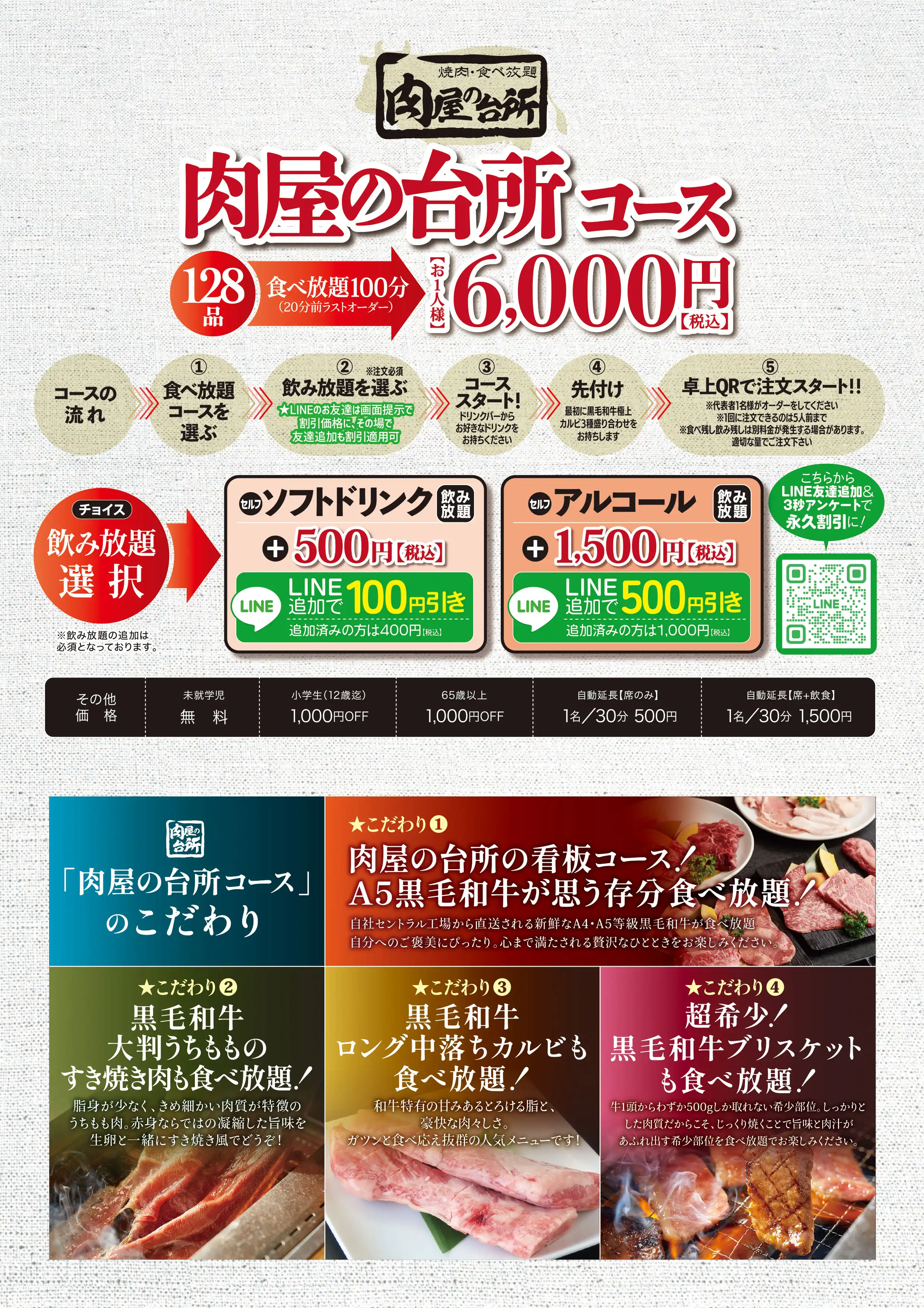 和牛焼肉食べ放題プランは6,050円~!カルビやロースから、A4・A5の和牛まで高品質のお肉をご提供しております。一度お召し上がりいただければ納得の旨さ!上野で焼肉食べ放題なら《肉屋の台所》がおすすめです!!黒毛和牛食べ放題の驚きのコストパフォーマンス!!お気軽にご来店下さい!