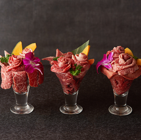 各種お祝いにSNS映えのする【肉パフェ】がおすすめ!見た目も楽しい食べておいしい絶品です。女子会・デートにもご利用可能。ワンランク上の和牛焼肉食べ放題ございます。《肉屋の台所 上野店》で女子会・デート・記念日のお祝いを♪ご予約お待ちしております。